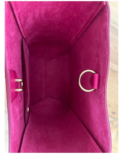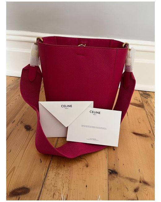 Celine Sangle small bucket bag. Dark raspberry soft grained leather. Gold hardware. Woollen strap which is removable. One internal pocket. Unused. Strap measurements 72cm length x 6cm width. Bag measurements: 24cm height x 18cm width x 11cm depth. Comes with dust bag for storage.