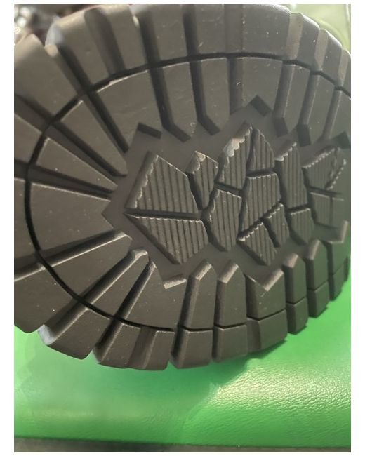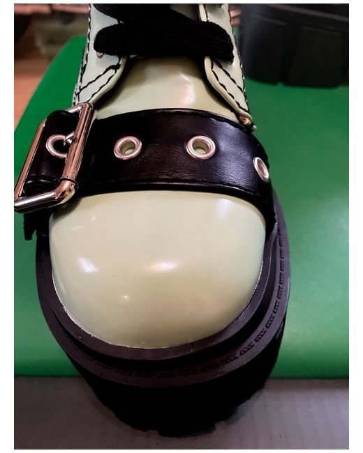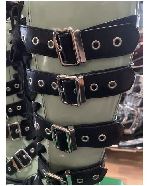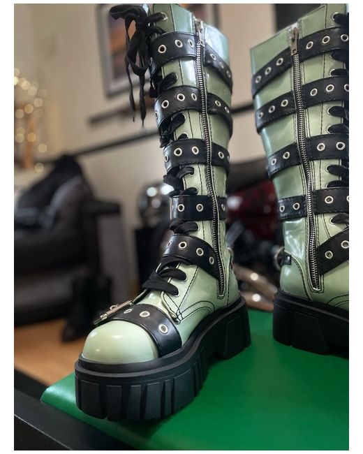 This pair of Dolls Kill boots in UK size 5 features a knee-high shaft style with a green synthetic upper. The boots have a platform heel style with a heel height of 6.5 cm. They are suitable for a punk, biker, Anime or Cosplay style, with a cotton lining and rubber outsole. The insole material is fabric, and they are made in the United States. 100% vegan boots.