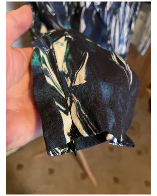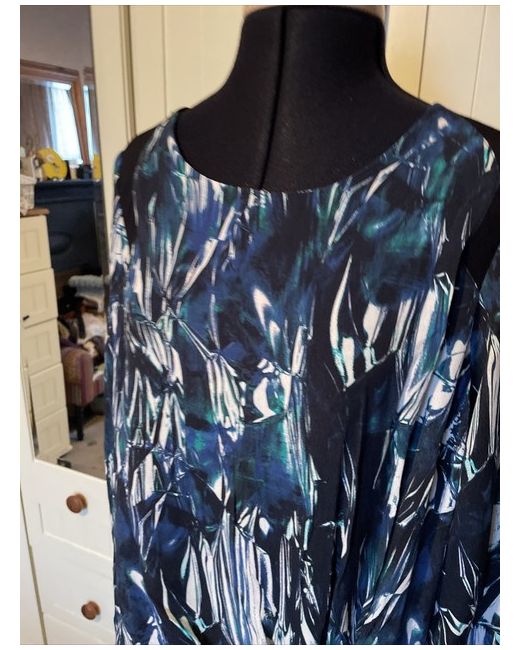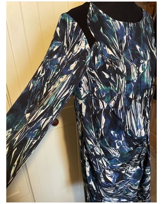 This lovely dress has made from a patterned fabric in shades of blue green and ivory with black trim. It has a subtle ruched detail to the front, and cut out detail to the back. It is also lined. Original RRP £85.00.