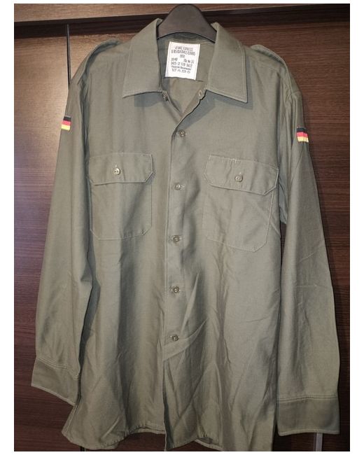 Khaki long sleeve shirt (military kind), sleeves can be folded up and fastened with the button. Medium size, with Nirvana logo on the back, Germany's flag on both sleeves.