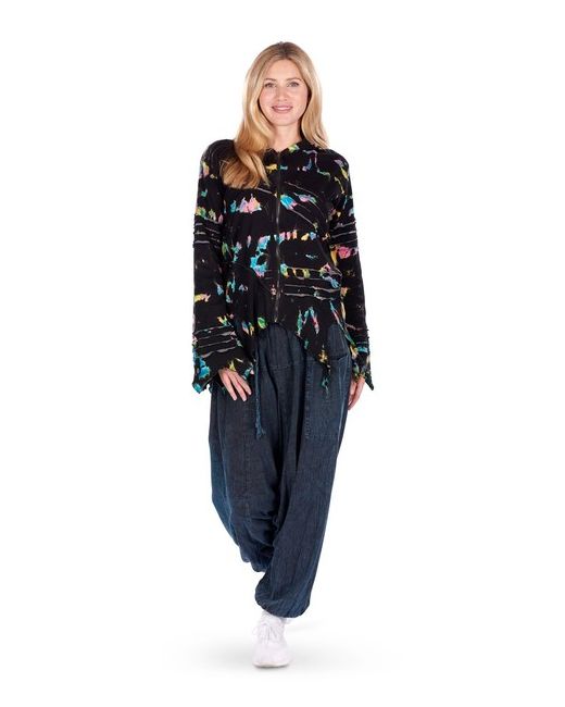 Stretchy cotton material, pixie hood and pixie pointy hem, zip closing, rainbow tie dye colours withrazor cut finish, flattering shape.