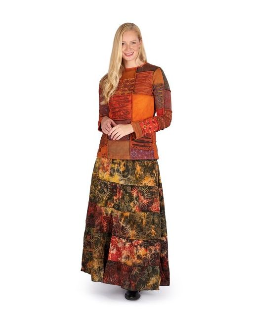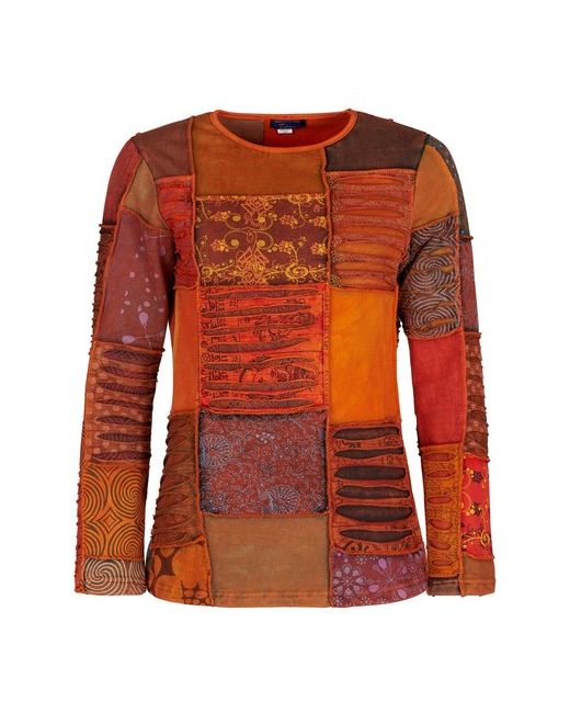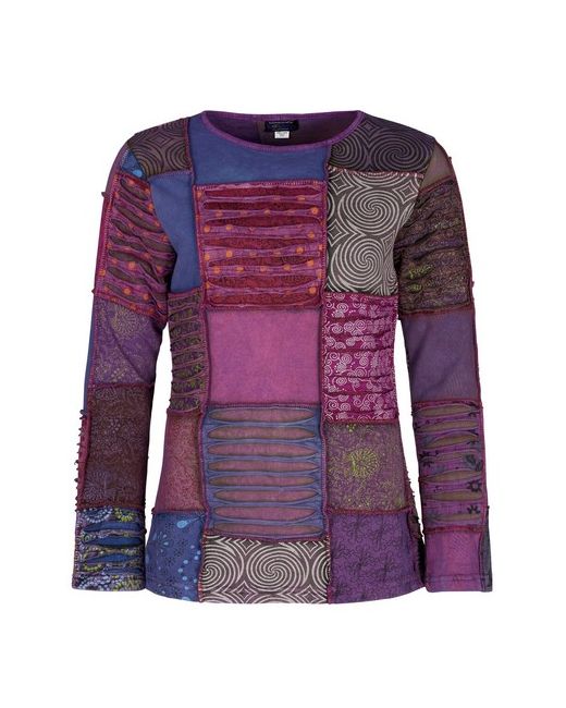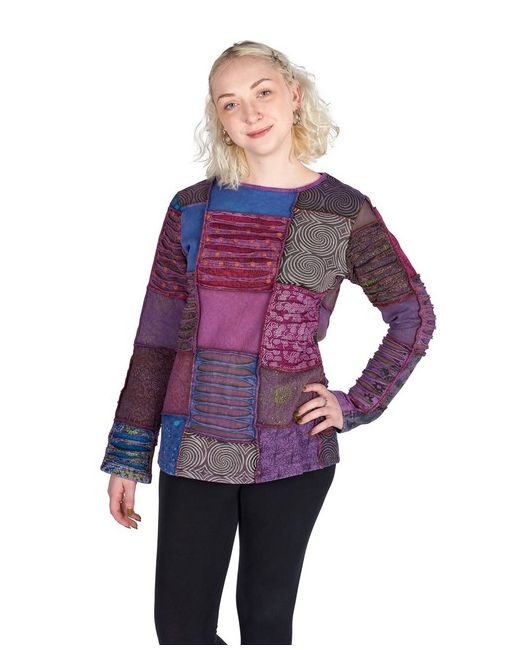 Patchwork of colourful cotton fleece, stretchy comfortable material, long sleeves, round neckline, warm and snuggly. Also colours are not always clear on digital image.