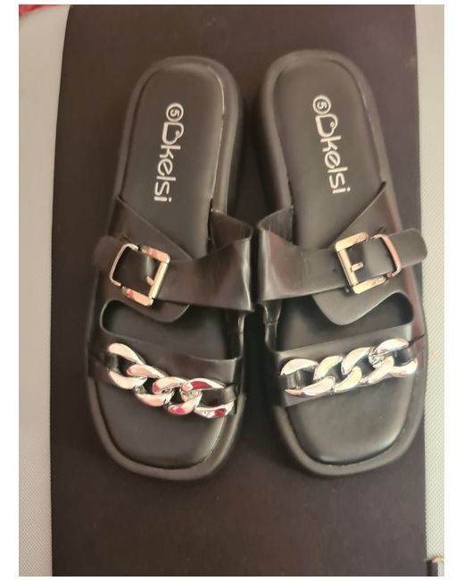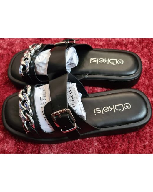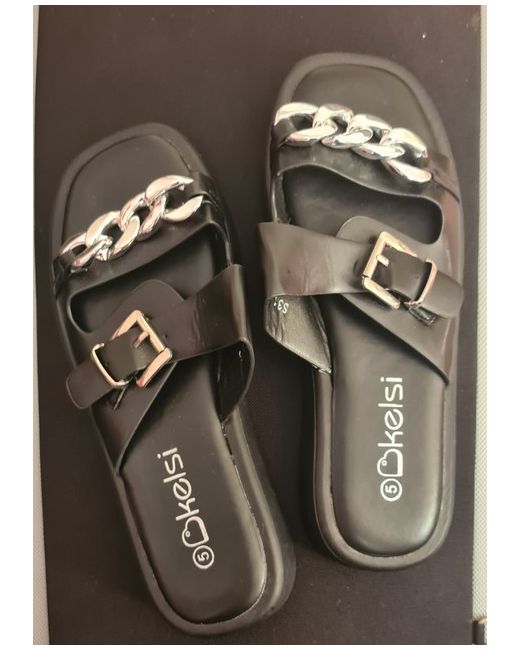 Step out in timeless style and comfort with the Kelsi Kelvin ladies' flat sandals. Perfectly blending elegance and practicality, these size 6 sandals feature a sleek black faux leather upper adorned with a chic chain pattern that adds a touch of sophistication to any ensemble, be it casual, business, or cocktail. Crafted with your comfort in mind, the sandals come with a host of features including breathable lining, arch support, and a lightweight design that ensures ease with every step. The durable leather outsole coupled with a low heel height of 2.5-4.9 cm offers a stable foundation, making these flats ideal for those who value both style and comfort throughout the day.
