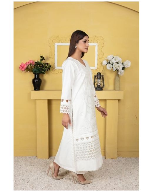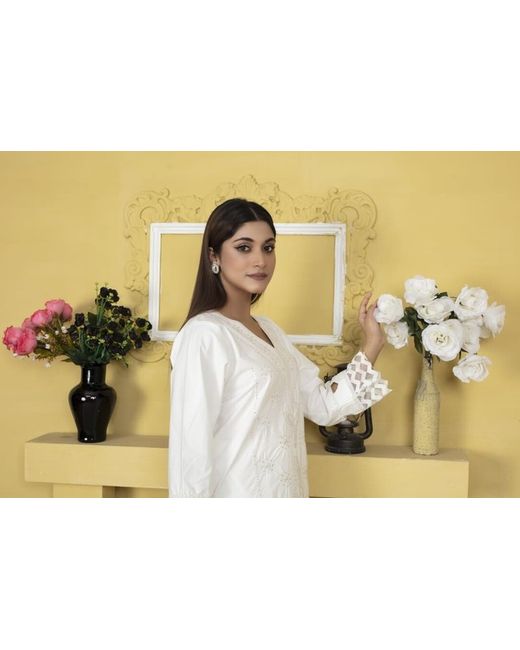 This beautiful two-piece outfit from Simple is perfect for any occasion. The top features a crochet fabric type with embroidered accents, while the heavy work border and long sleeves add a touch of elegance. The trouser is made of cotton material and has a straight leg style, making it comfortable and easy to wear. Ideal for parties, festivals, or even everyday wear, this outfit/set is available in sizes S, M, and L and comes in a stunning white colour. Whether you're looking for something casual or formal, this Crochet suit is the perfect addition to your wardrobe.