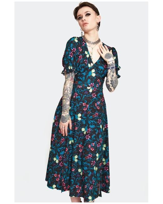 Gothic midi dress, featuring venus flytrap print, multicoloured, deep V neck, elastic ruffle short sleeves, midi length. Dress Length : Midi. Colour : Multi. Fabric: Knitted 95%Polyester 5%Elastane. Character : Knitted 95%Polyester 5%Elastane.