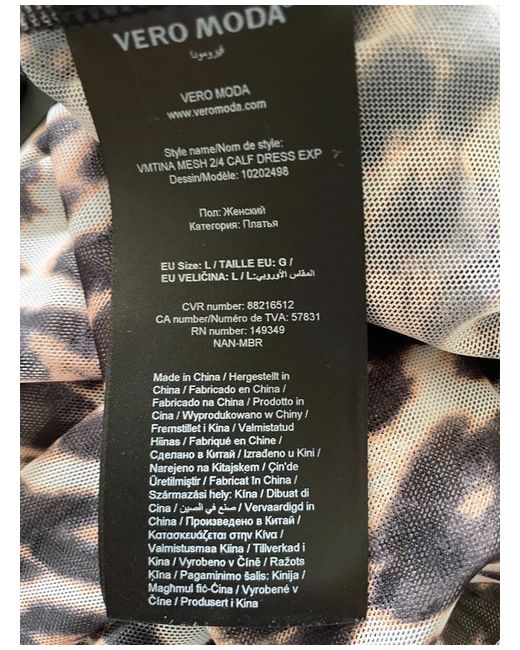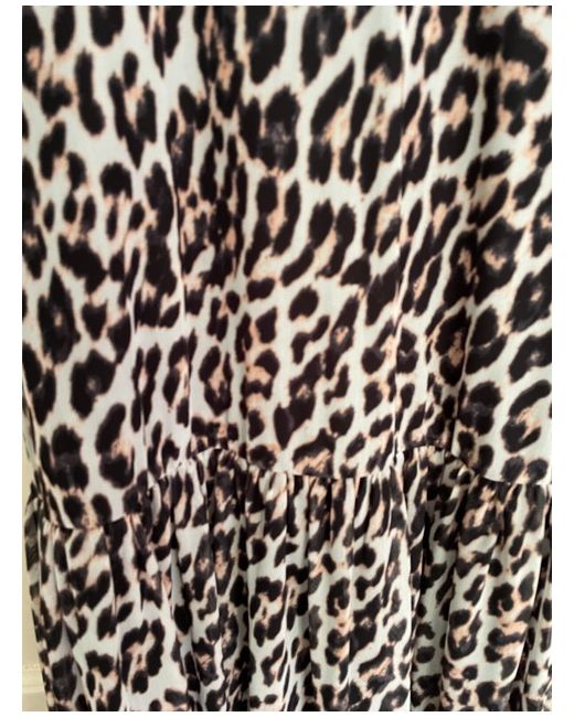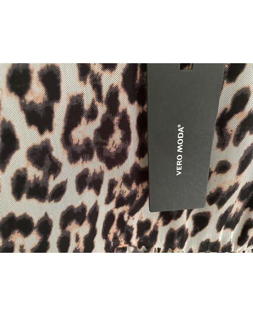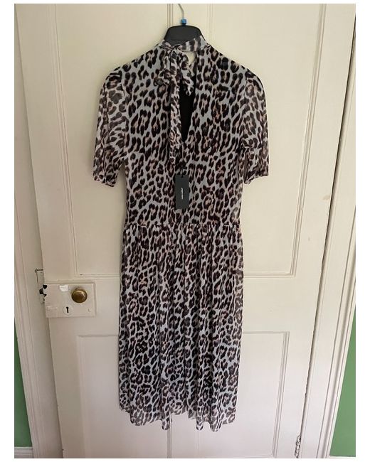Vera moda leopard print dress in size L - a generous size 12. The background is a palish blue and the print is chocolate brown and beige It has a zip at the back and then a gap to create a key hole, and tie neckline.