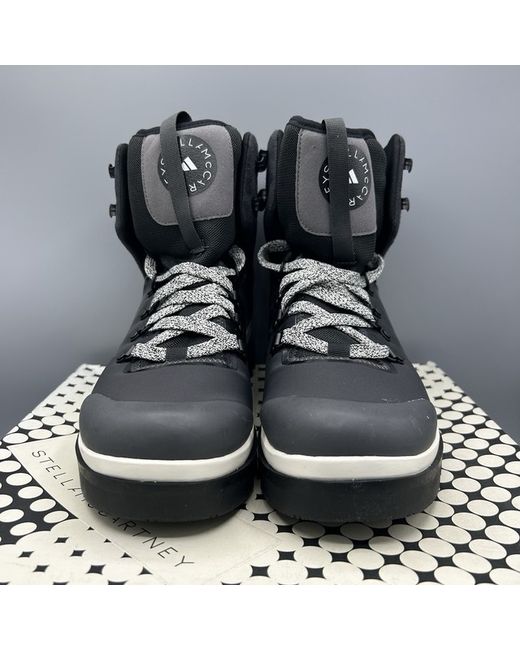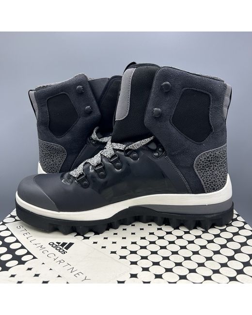 The Adidas Stella McCartney Eulampis Black Hiking Walking Boots in UK size 8.5 and EU size 42.5 are a stylish and practical choice for outdoor enthusiasts. With a round toe, ankle shaft style, and lace-up closure, these boots offer comfort and support for hiking and walking activities. Made from suede, they also feature a combat style design, making them versatile for casual occasions. The black colour and outdoor theme add a touch of sophistication to these unisex boots from the collaboration between Adidas and Stella McCartney.