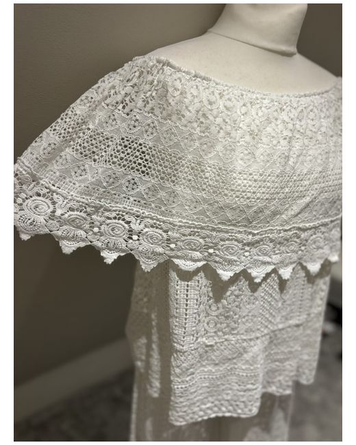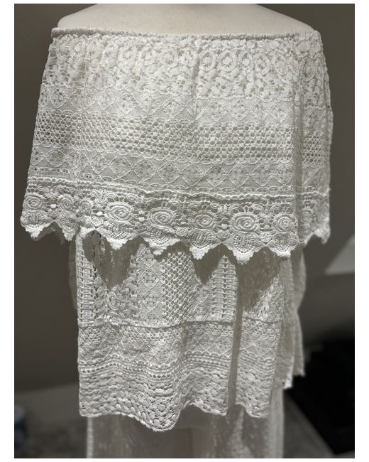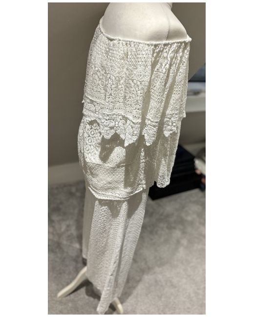 This is a white two-piece coordinated set, made from lace or a similar textured fabric. The top features an off-the-shoulder or wide neckline with a loose, flowing fit. It has a detailed lace pattern with scalloped edges at the hemline, adding a delicate touch. The sleeves are short and also have a loose fit. The bottoms appear to be wide-leg pants with the same intricate lace pattern, giving the set a cohesive look. The pants are long and flowy, matching the relaxed style of the top. Trousers and top individually tagged and priced on each item. The set is a size 10-12 and is priced at £65 BRAND NEW .