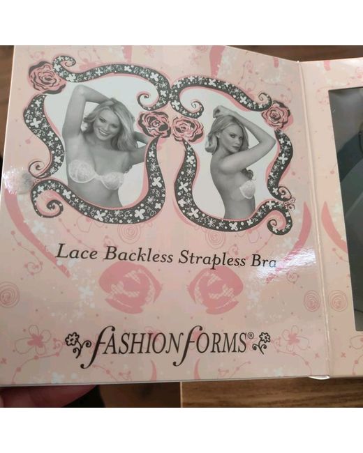 This is a black Lace Backless Strapless Bra by Fashion Forms, featuring a lace flowers pattern. It is a C cup size Stick on Bra with a strapless design, ideal for backless outfits. Perfect for women seeking a stylish and supportive undergarment. Brand new in box. Can be used up to 25 times.