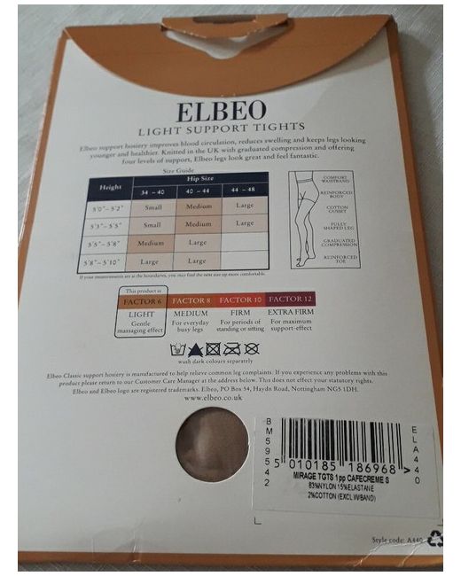 Elevate your everyday look with these Elbeo Mirage tights in the beautiful Cafecreme shade. Perfect for women who appreciate style and comfort, these tights provide light support with a factor of 6. with fully shaped leg. The nylon material offers a sheer, elegant finish and is designed to fit size small. These tights are perfect for any occasion, whether it's for work or leisure with reinforced body and toe. The compression feature ensures that you feel comfortable all day long, with cotton gusset, while the hand wash-only care means these tights will last for a long time. Made in the United Kingdom, these Elbeo tights are a must-have for any fashion-forward woman.