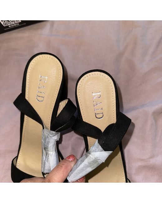 Step out in style with these black strappy Raid heeled sandals. The faux leather upper material gives a comfortable fit and the UK shoe size 6 is perfect for women who want to make a fashion statement. These heels are perfect for any occasion and the stylish design is sure to turn heads. The Raid brand is known for its quality and these sandals are no exception. They are a great addition to any wardrobe and can be paired with any outfit. Whether you're dressing up for a night out or just running errands, these heels will give you the confidence you need. Don't miss out on this opportunity to add a touch of elegance to your shoe collection.
