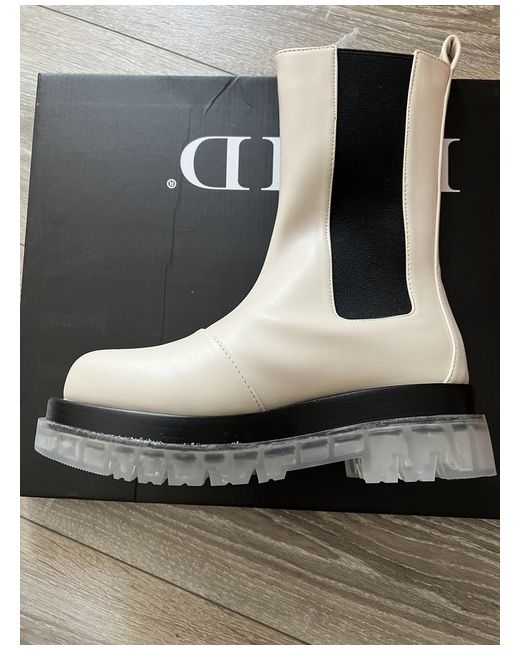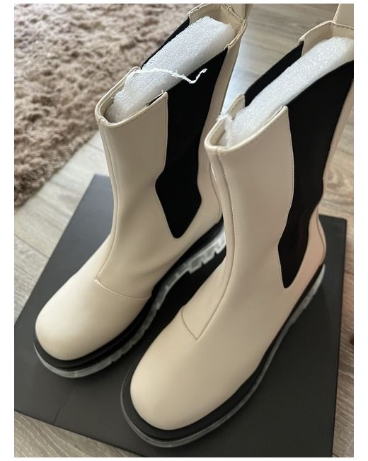 Mid Calf boots with contrast sole in off white/beige colour Elasticated inserts Chunky sole Smooth faux upper leather I bought them from ASOS but missed return deadline. They are perfect for cold weather, keep your feet warm thanks to higher platform. I have them in different colour and wasn’t sure about keeping them because I have slightly larger calves but I really love them now.