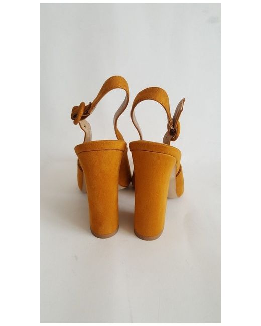 Heels by Raid. Block high heel. Yellow suede. Sharp point toe. Ankle-strap fastening. Heel height: 4.5”.