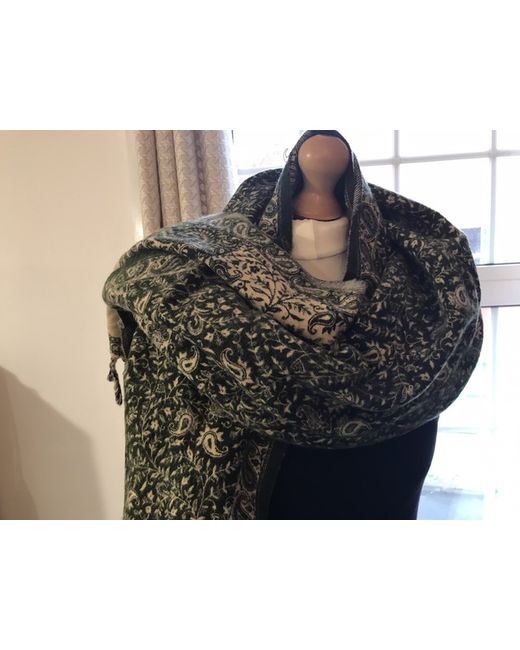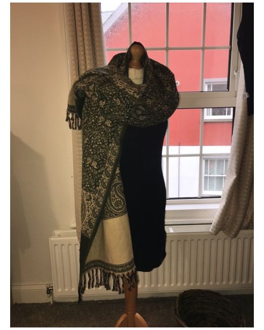 This a a very beautiful large reversible yak wool blend shawl in a lovely dark green and cream color. It is very versatile and super warm.
