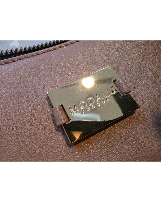 The bag features a secure zipper closure, a brown leather strap, and gold-tone hardware that adds a touch of sophistication.