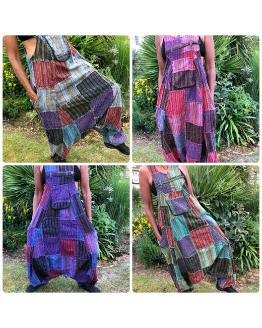 Stand out from the crowd in these unique, unisex multicoloured Stripe Patchwork Harem Dungarees. Made from 100% cotton, these overalls are both comfortable and stylish. Drop crotch harem style with elasticated ankles.