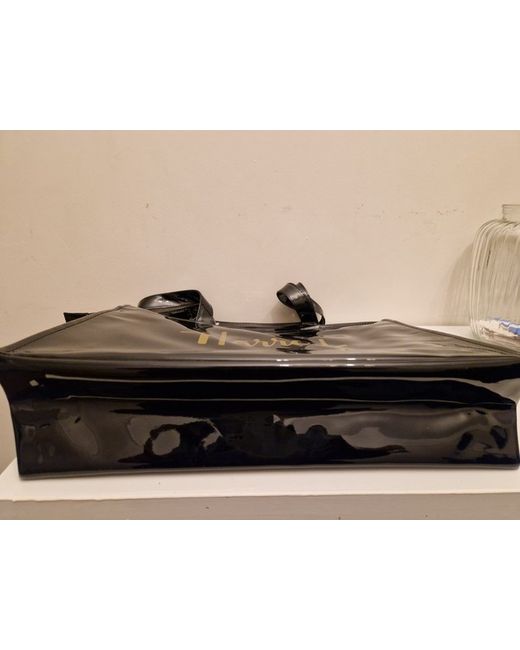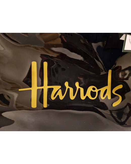 This is a new Harrods tote bag in glossy black with a logo pattern. Measures H29cm x W39om x D10.5om approx. It has twin top handles and made from PVC which can be wipped clean. It has a zipp closure and zipped interior pocket. There is a slight scratch at the bottom corner as shown on the last photo. It is a stylish and practical accessory perfect for daily use.