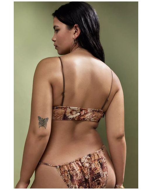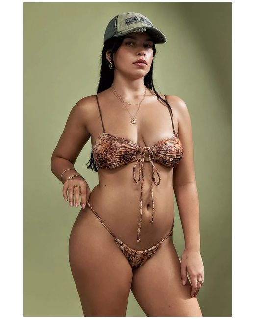 Ornate print details top this ruched bikini top by Out From Under. Strappy side silhouette bottoms with a low-rise waist and cheeky coverage to reverse. Bikini Bottoms. Bikini Top. - Machine wash. - 82% Recycled polyester, 18% Elastane.