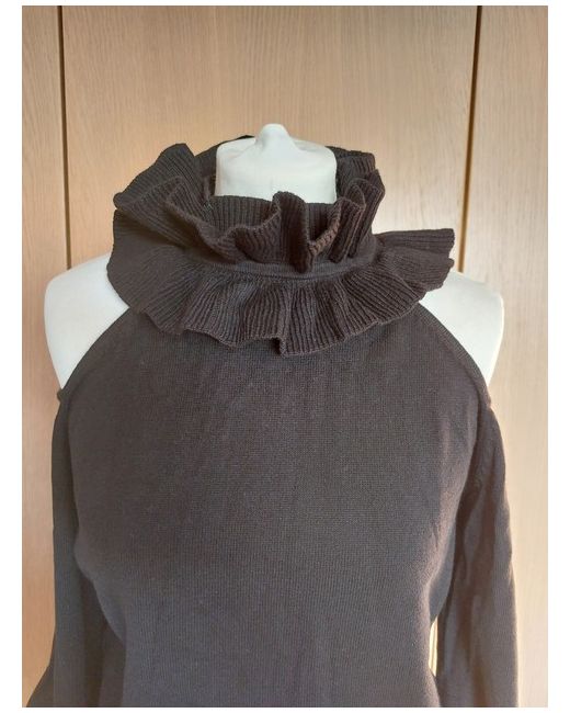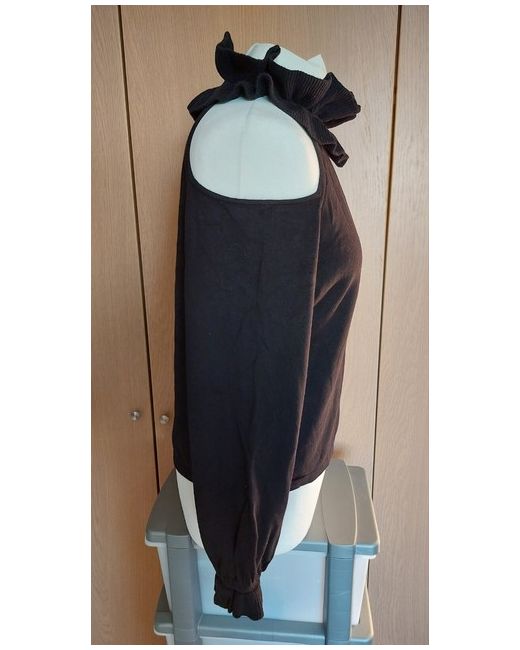 This Lost Ink black jumper in size 14 for women features a collared ruffled neckline, cut off shoulders and long sleeves, making it a stylish addition to any wardrobe. The regular fit pullover is perfect for casual wear and can be easily paired with different bottoms for versatile outfit options. Made by the brand Lost Ink, this new jumper without tags offers a classic yet trendy look ideal for any occasion.
