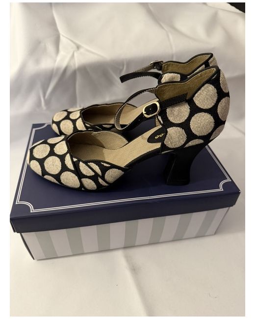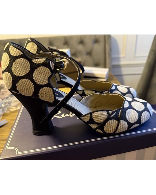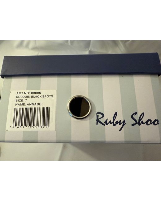 New flared heel bar shoe ANNABEL features clean sweeping lines in a black classic linen-look spot fabric, picked out with micro-dot piping and lining. Ruby Shoo ANNABEL matches perfectly to bag style RIVA. Upper: Textile Lining: Textile Sole: Man made materials Heel Height:80mm RRP £50