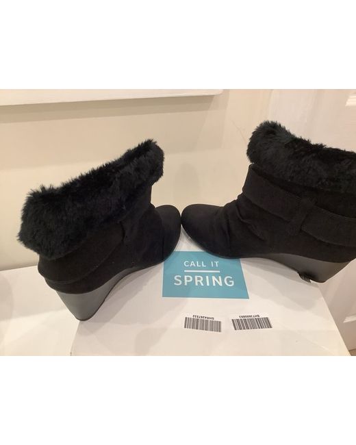 These Call It Spring Women's Black Slip-On Ankle Boots in UK size 6 are a stylish choice for any wardrobe. The boots feature a faux suede upper material with a synthetic lining, providing a comfortable fit. The slip-on design and ankle shaft style make them easy to wear, while the black colour adds a versatile touch that can be paired with various outfits. Wedge Heel and Faux Fur Top.