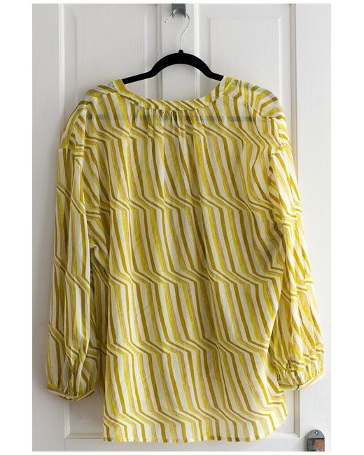 Blouse with a yellow and brown pattern. Size Eur 46 or UK 18. Due to the light and different device settings, colours may differ slightly in real life. Machine washable at 30°C.