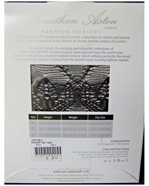 From Jonathan Aston Fashion Tights: "Crochet Net Tights" in black sheer tights with delicate repeat soft pattern all over the legs. Made of 90% Polyamide 10% Elasthane. They feel lovely and soft. Made in Italy.