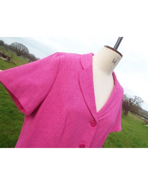 Raspberry Short Sleeve Gently Tailored Jacket. It is a hard shade to describe but in my opinion it is a raspberry shade. This jacket is not lined. Length from top of shoulder to hem is approx 26”. A very flattering, versatile jacket…a great addition to any wardrobe!