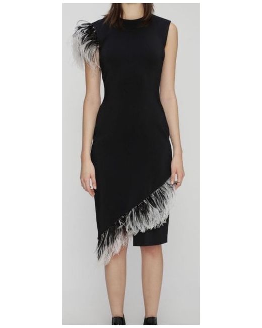 Christopher Kane midi dress is a must-have for any fashion-forward woman. The dress features a sleeveless crew neck design, asymmetric mid length with ostrich feather trims at shoulder and front hem. Has a back zip closure, perfect for a party or cocktail occasion. The dress is available in size 42 EU/10 UK, and is made from a heavy crepe, a blend of viscose and elastane materials, ensuring comfort and durability. The black colour and pencil dress style make it suitable for any season. Materials: 95% viscose, 5% elastane Lining: 74% acetate, 25% silk Embellished with 100% ostrich feather. Measurement: Length 42in Ptp 17in Condition never been used with tags