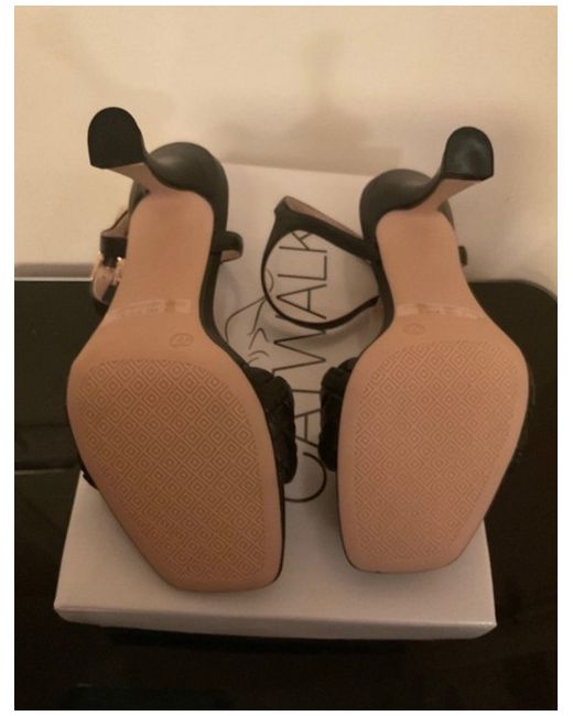 These are Catwalk 4” heeled sandals in black with gold style curb chain with a stiletto heel style.