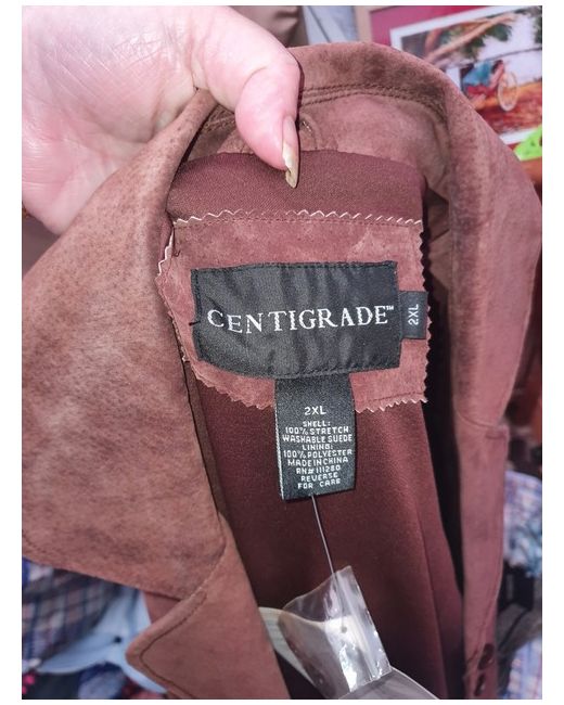 This is a brown suede coat by Centigrade, suitable for various occasions like travel, casual outings, work, or business. It has a mid-length, long sleeves, button closure, and is insulated with polyester. The coat is a size 2XL with a regular fit, ideal for autumn and winter wear.