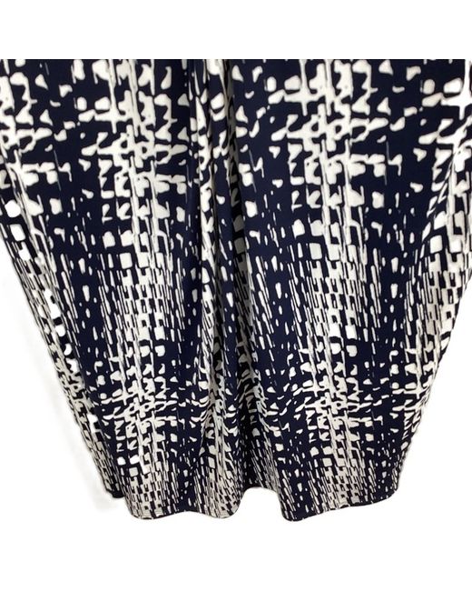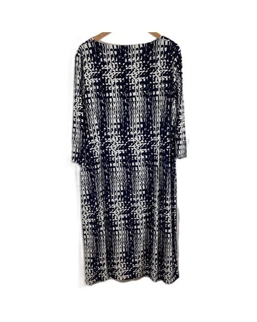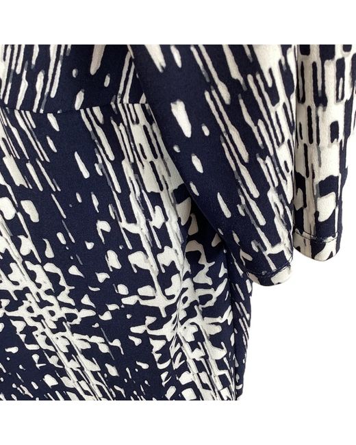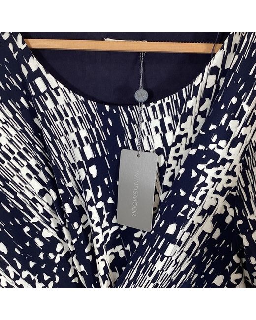 The Windsmoor Navy and White Abstract Pattern Wrap Effect Dress is a stylish and versatile piece that can be worn in various settings. The dress features a wide neck and 3/4 sleeves, providing a comfortable fit and a flattering silhouette.