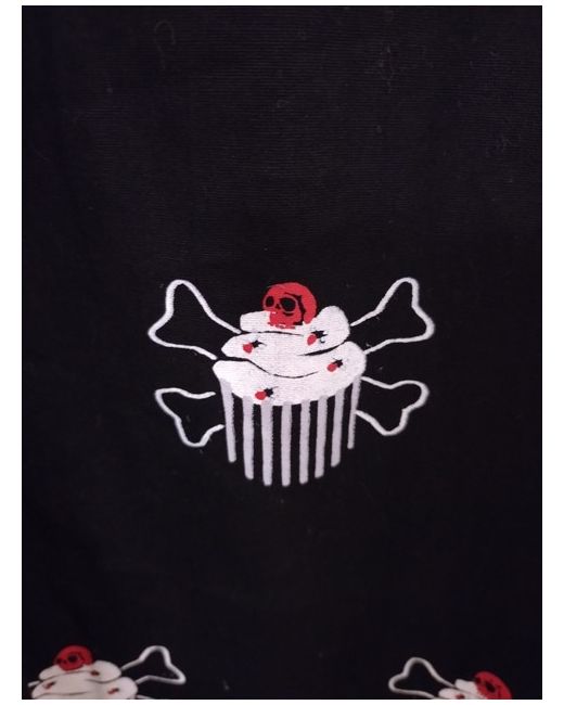 This gothic dress in size 8 features a dead cupcake pattern, sleeveless design with a scoop neck and strappy sleeves. Made of cotton fabric, it has a zip closure at the back and is adorned with strap and bow accents. The short dress is black in colour and from the brand Dead Threads, suited for occasions like travel, weddings, parties, casual and formal vents. Black dress with gothic cupcake design and spaghetti straps. Attached black sash belt. Only worn once or twice. Great condition.