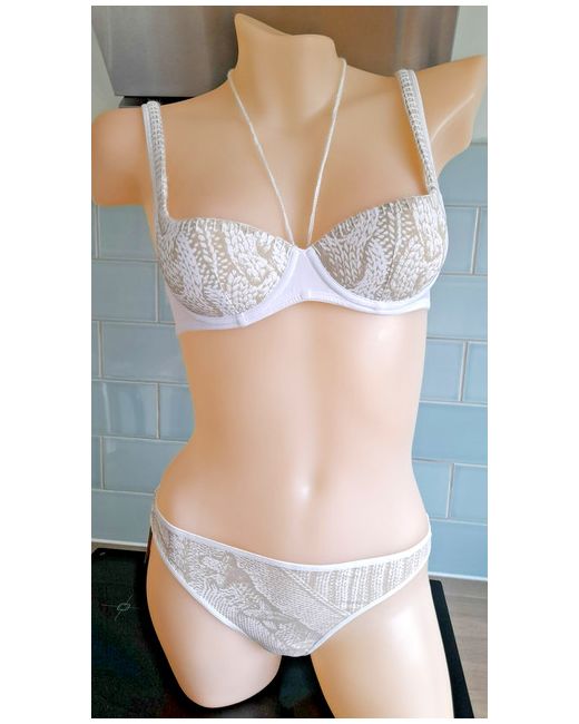 From Marlies Dekkers Undressed, the WHITE/beige, wool patterned, mid rise, narrow sided thong, style: 12202. These have a main front panel with a beige and white cable stitch knitted pattern in microfibre, from the hip sides down over the outside of the gusset to the back gusset seam.