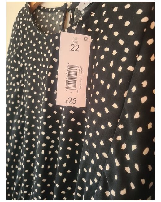 BNWT black with off white 'dots' Size 22. Button fastening. Elasticated waist. Long sleeve with elasticated cuff Length centreback 47 inches. Waist not stretched 20 inches across. Sleeve length to underarm 14 inches