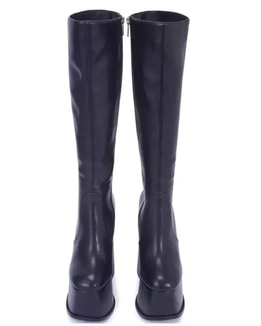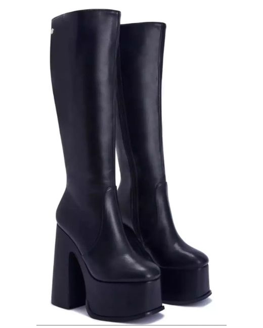 Crafted with a sleek black finish, these boots feature a dramatic high block heel and a substantial platform for added height and comfort. UK 4 EU 37 USA 6. The side zipper ensures easy wear and removal, while the smooth faux leather gives them a polished, modern look.