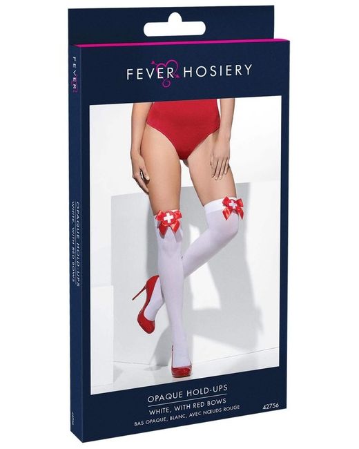Opaque Hold-Ups, White, with Red Bows Complete your dress-up costume with the White Opaque Hold-Ups featuring gorgeous red bows. They'll provide the perfect finishing touch to your nurse outfit. Available in one size. Washing Instructions: Hand Wash Separately Product Code: 42756