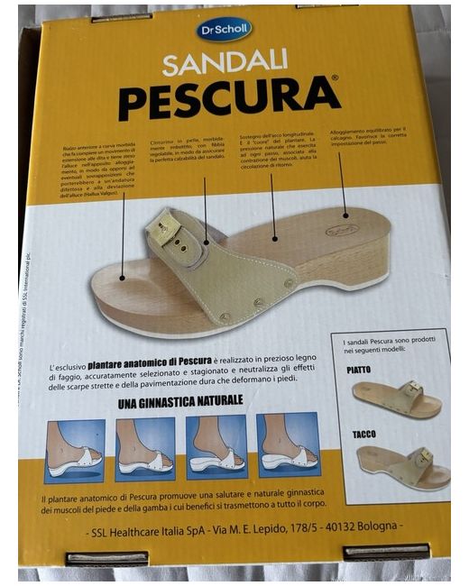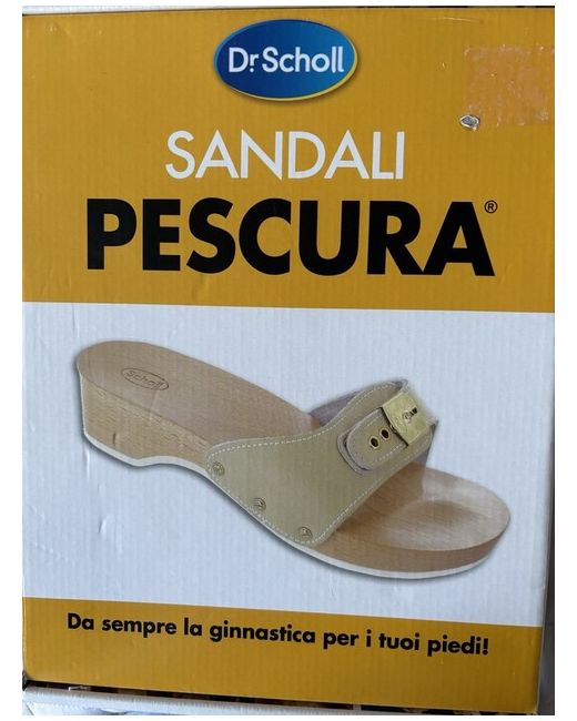 Scholl vintage Pescura Clogs with ‘toe bump’. Traditional wooden mule with white leather adjustable strap and gold buckle with the Scholl emblem. Beachwood base also with engraved Scholl emblem. New, unworn and in mint condition with box.