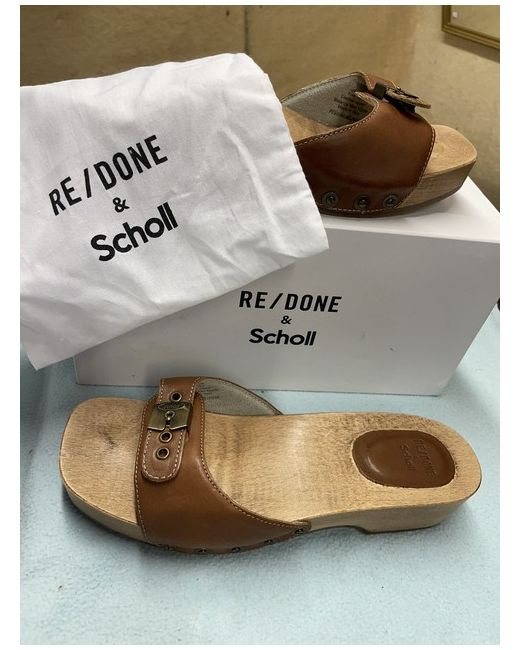 Here for sale pair of RE/DONE collaboration Scholl Sandals. With striking brown coloured straps with, the distinctive Scholl shaped foot bed - they are labelled a Size US 10M / EU 40 - with a buckle that lifts rather than slides! New and unworn, complete with original fabric dust bag and box so in fabulous condition. Naturally cleaned ready to be sent to their new home! Now sold out on the Scholl website - Dead sassy and really unusual...! Will be sent well packaged from our non smoking home Thanks for your interest.