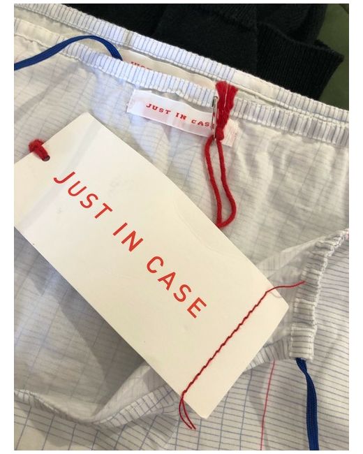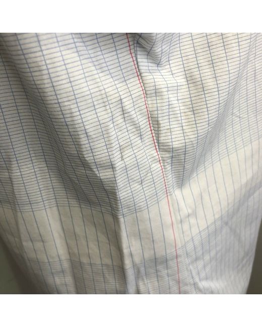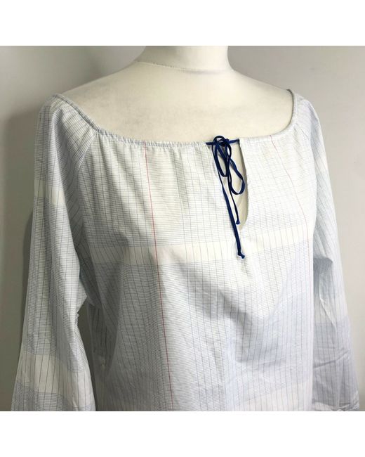This is a super top from Just in Case –it is white with a graph paper check in blue with the occasional red line –wide smock style neckline with tie detail –bracelet length sleeves with tie cuff. Size 40 or UK 12.