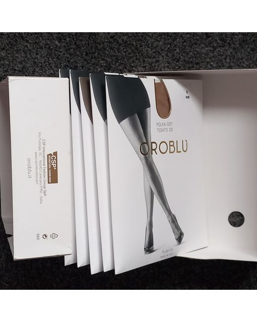 I have for sale a box of 5 pairs of Oroblu 20 denier Polka dot tights, Adelle, in nude, size small, presented in a genuine Oroblu box.