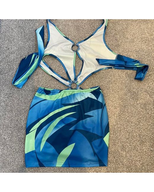Geometric pattern cut out halterneck dress. Geometric pattern halterneck cut out dress Blue and green colour scheme. Adjustable halter neck and back tie. With ring detailing. Brand-new never worn, never came with tags. Size medium