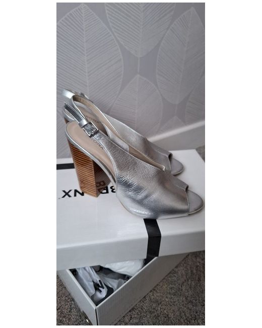 New in box, size 7 Adjustable ankle buckle Block heel Silver leather