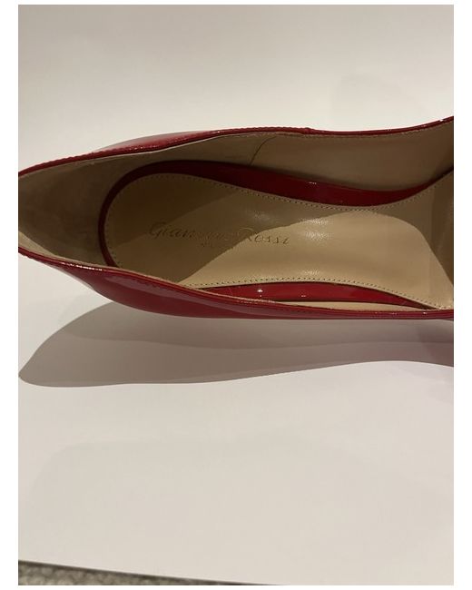 This is a new pair of Gianvito Rossi heels in British size 7. The shoes are a stylish court style with a pointed toe and stiletto heel, made of red patent leather and have never been worn. The outsole and upper material are also patent leather, while the insole is leather. These heels have a very high heel height, over 10 cm.