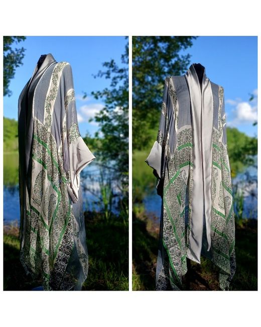 Handmade from carefully sourced luxury bespoke fabrics. This is an Exclusive one-of-a-kind kimono Jacket design. The Kimono Jacket features a silver satin cuffs and collar. With top stitching details.