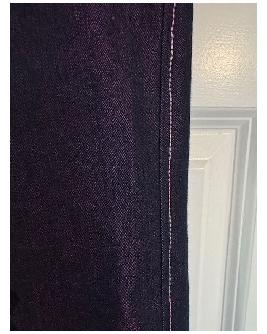 The denim has pink interleave which adds a two tone effect. Stitching detail with graduated thread. Heavy weight denim. Button and zip closure. Two front pockets. Two back pockets. Machine washable 30 degrees.