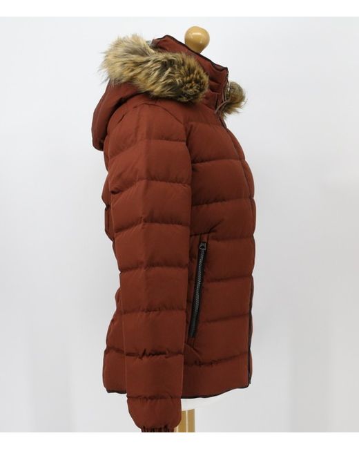 In a auburn red colourway, this jacket features the following Detachable hood with faux fur edge. Adjustable hood. Shell & Lining 100 % Polyester. Insulation 80% Duck Down 20% Duck Feathers. Elasticated centre back.