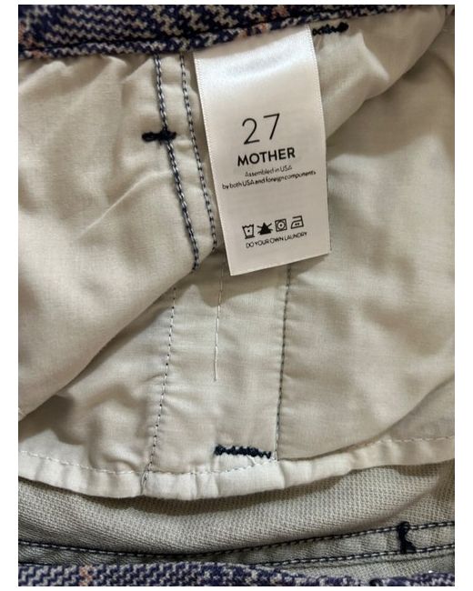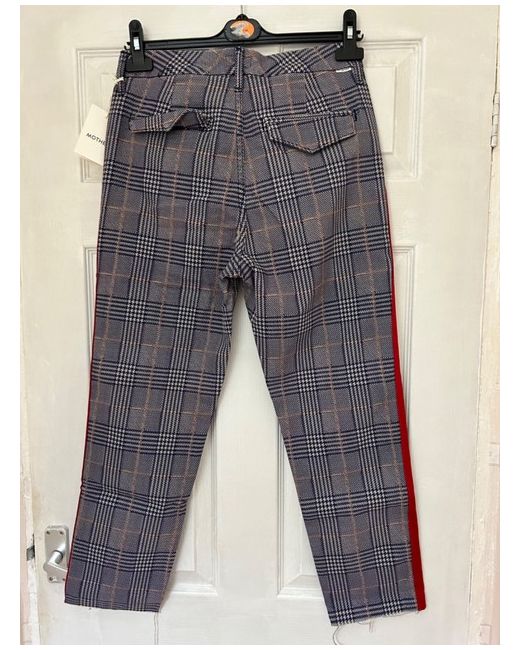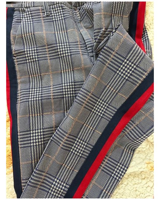 Plain weave, side seam stripes, prince of wales design, mid rise, regular fit, tapered leg, raw-cut hem, stretch.