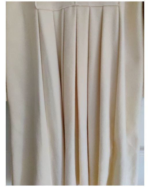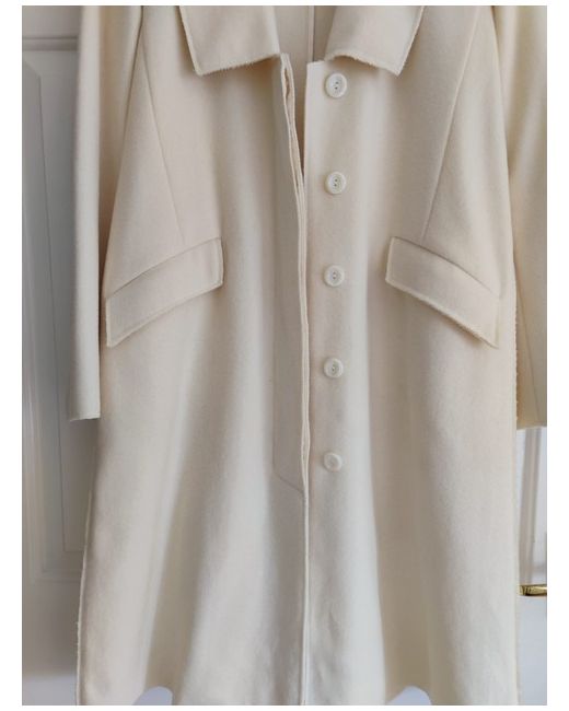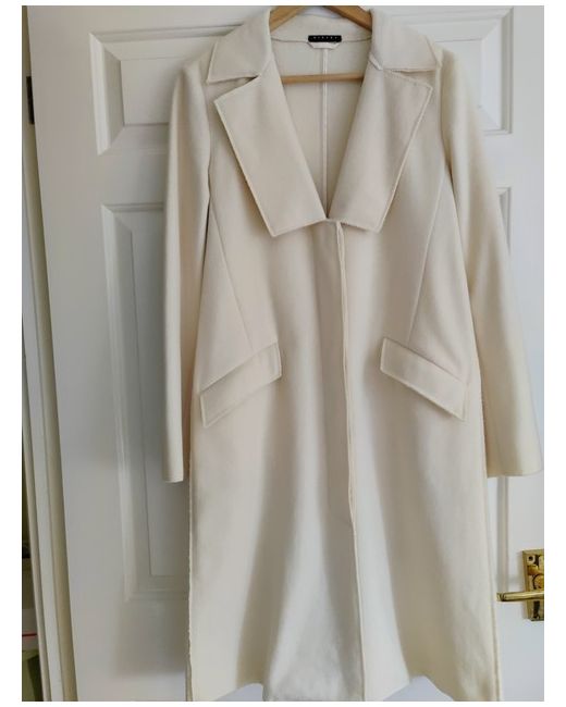 This is a classic cream wool coat by Sisley, featuring a button closure and button accents. Made in Italy, it is designed for casual occasions and is suitable for winter, autumn, and spring seasons. The cream coat has a designer theme and a regular fit, perfect for women in size 10. It requires dry cleaning for garment care.