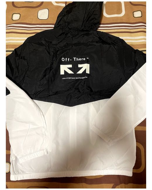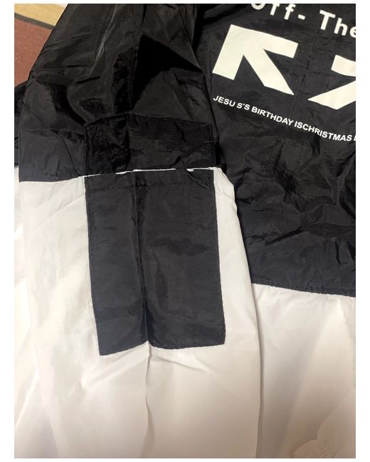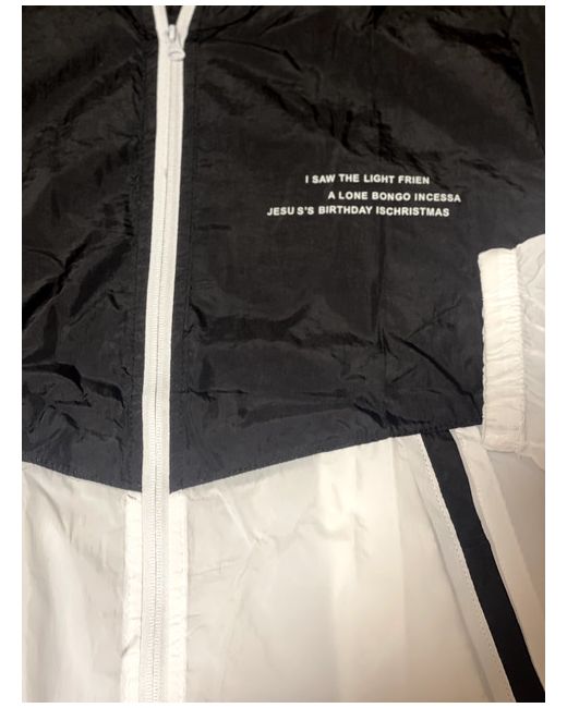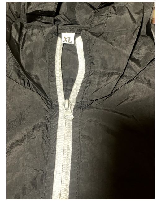 rain jacket with hood for women, size XL with a zipper and pockets, a small pocket on one arm also. perfect for normal weather or rainy weather. not for cold weather. half black and half white.